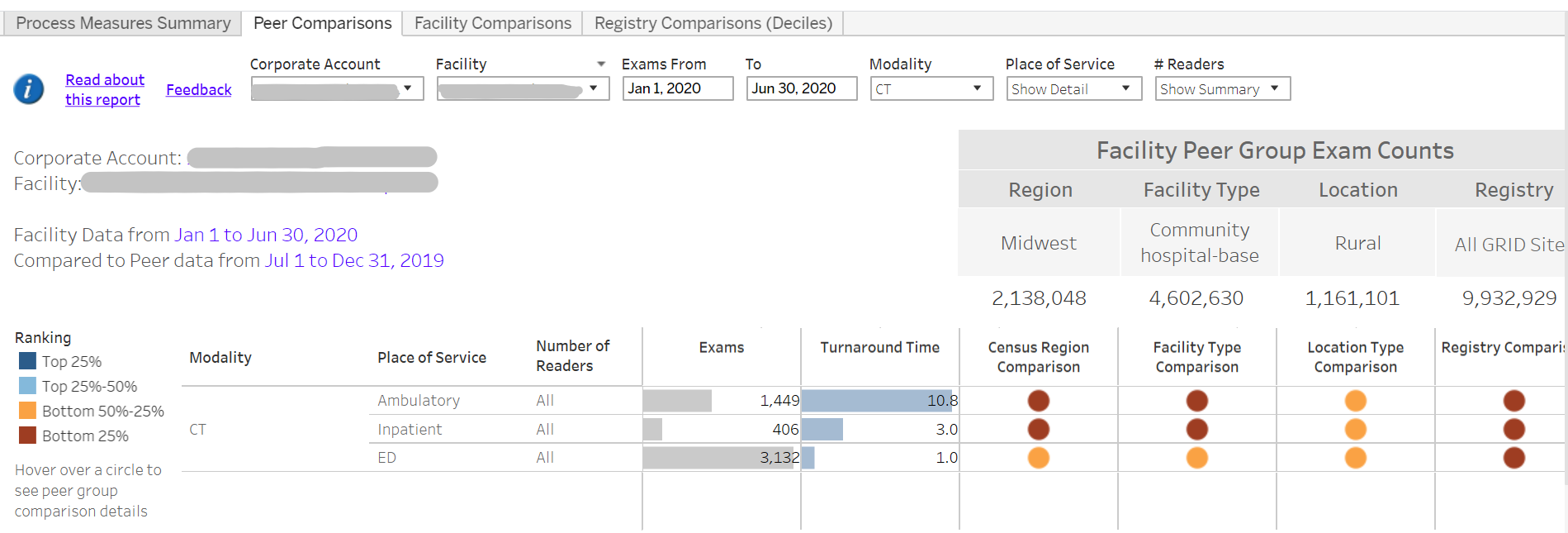 The GRID Facility Comparisons Report is an interactive report that allows you to benchmark radiology turnaround time performance against peer facilities. Benchmark comparisons among facilities under the same NRDR Corporate Account can also be observed. The GRID reports can help participants identify areas for improvement and track quality improvement efforts over time. Updated weekly, the report also provides performance insight for facilities reporting turnaround time measures for the Center for Medicare and Medicaid Services (CMS) Merit-Based Incentive Payment System (MIPS).